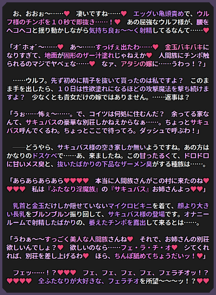 「あらあらあらあら♥♥♥♥ 本当に人間族さんがこの村に来たのね♥♥♥♥ 私は『ふたなり淫魔族』の『サキュバス』お姉さんよっ♥♥」