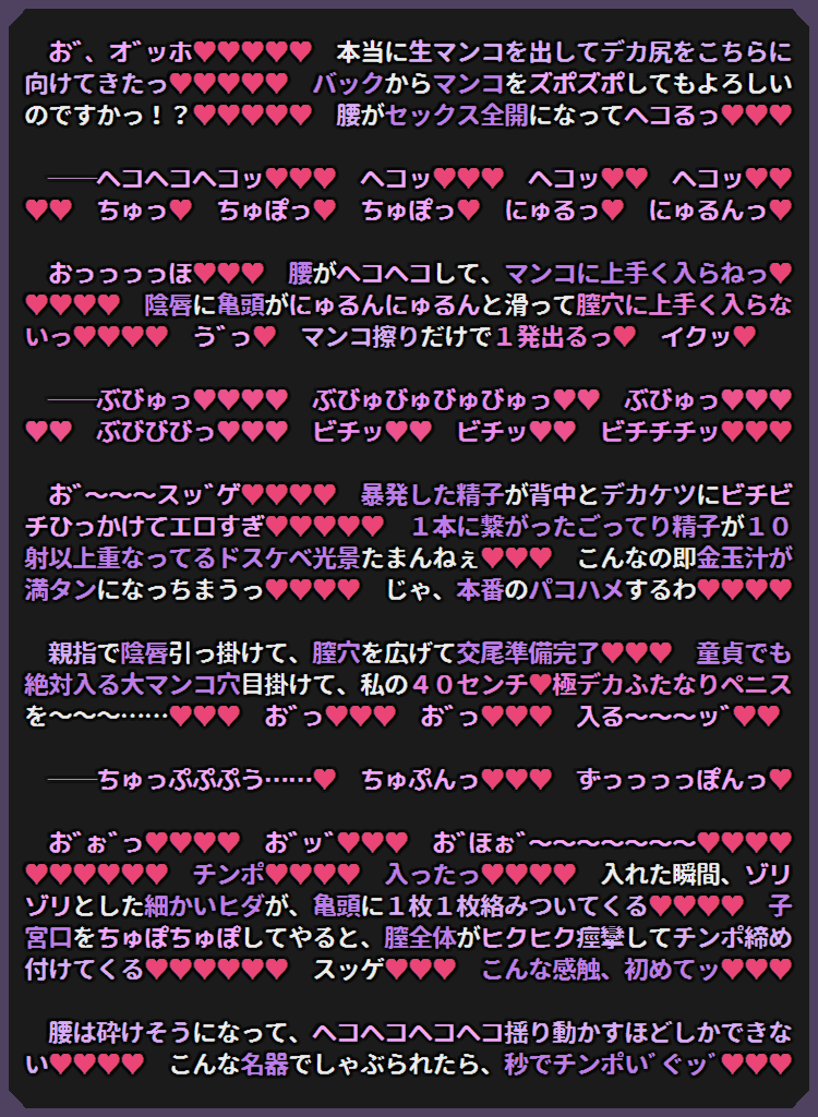 「あ゙ぁ゙~~~エグ亀頭コキされて精子ブリブリ出てくる♥♥♥ いつも30分かかる射精が、オマエの適当な手コキで10秒早漏暴発イキしたわ♥♥♥♥ イッてる最中も、指で作った輪っかでカリ首を小刻みにコキコキして、腰砕けるほど精子出るわ♥♥♥ あ~~スッゲ♥♥♥」