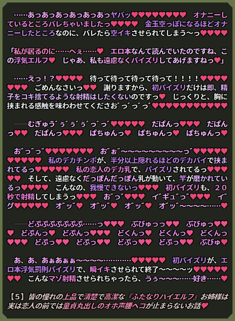 「今日はワルモノのふたなりをやっつけてきたんですって~?♥ めちゃくちゃ格好良いです、ハイエルフ様♥♥♥ ご褒美にぃ……初めての手・コ・キ♥ しちゃいましょうか?♥ 1発抜いちゃいますよ?♥」