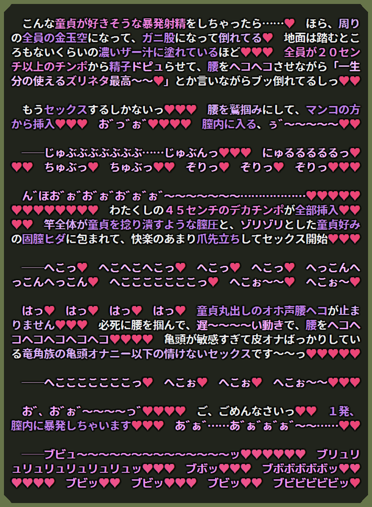 こんな童貞が好きそうな暴発射精をしちゃったら……♥ ほら、周りの全員の金玉空になって、ガニ股になって倒れてる♥ 地面は踏むところもないくらいの濃いザー汁に塗れているほど♥♥♥ 全員が20センチ以上のチンポから精子ドピュらせて、腰をヘコヘコさせながら「一生分の使えるズリネタ最高~~♥」とか言いながらブッ倒れてるしっ♥♥